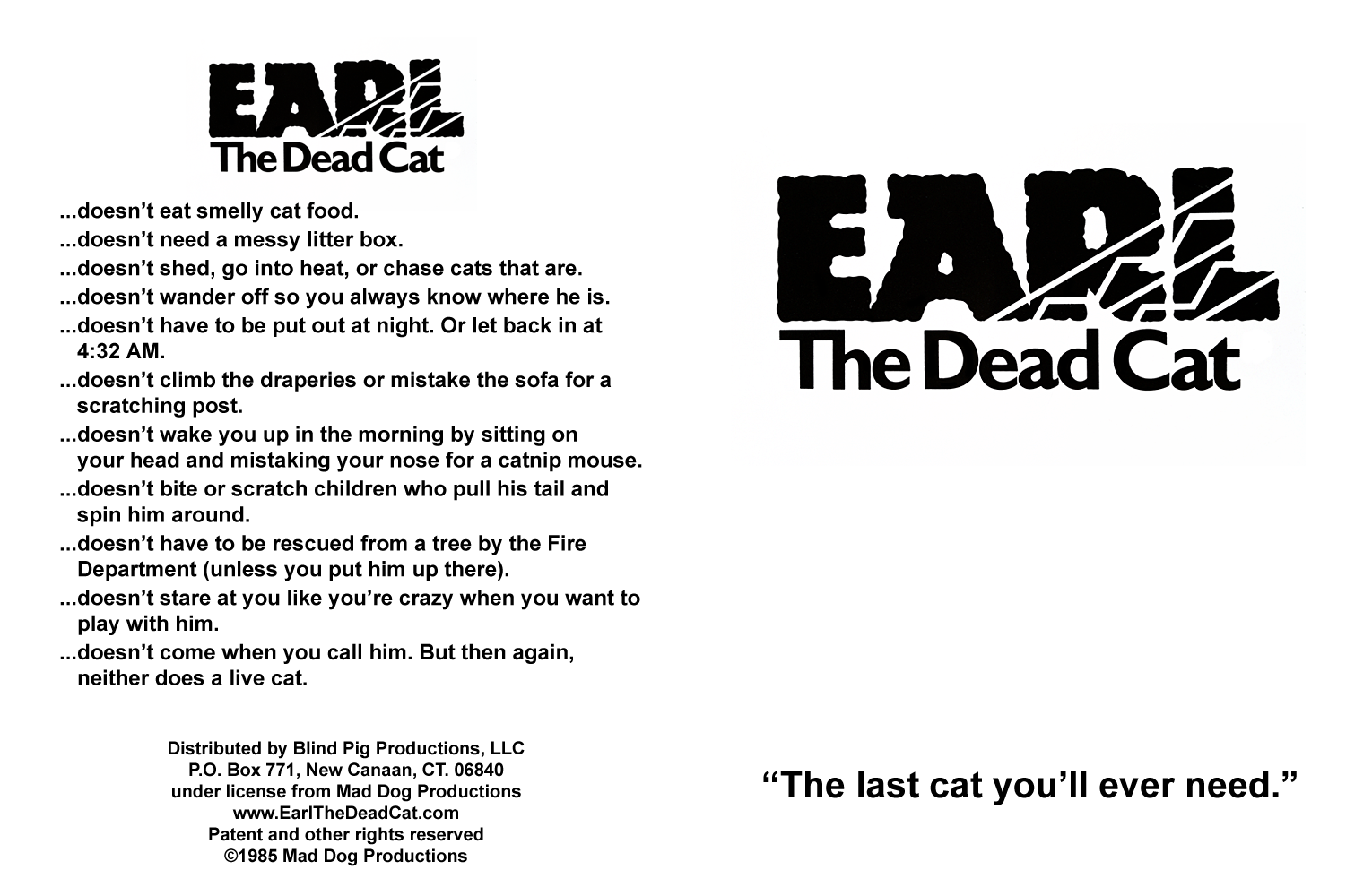 Say goodbye to messy litter boxes, smelly cat food, and being woken up at 2:00 a.m. because “someone” mistook your nose for a catnip mouse. Earl the Dead Cat is the purrrfect maintenance-free pet!