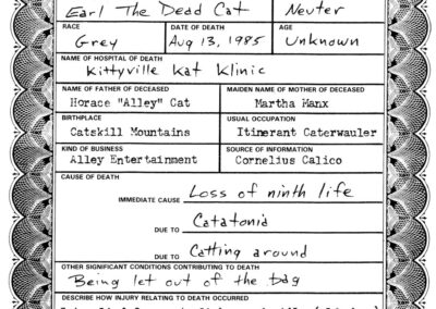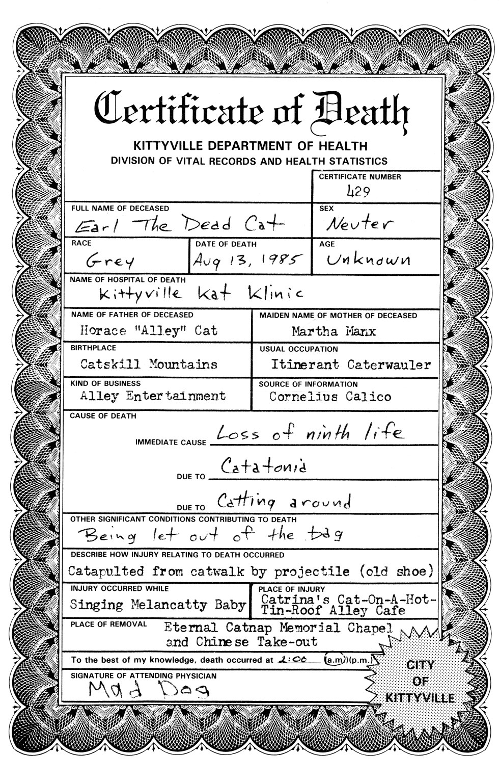 Earl the Dead Cat came complete with a humorous death certificate listing just a few of the many reasons he’s better than a live cat.