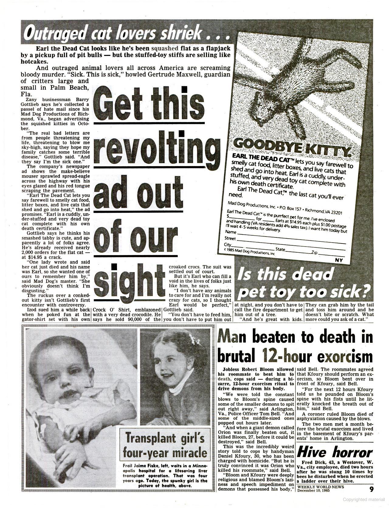 Yes, this is the same Earl the Dead Cat that was on the Tonight Show with Johnny Carson. Twice. Was featured in the Weekly World News. Twice. And until recently was considered a collector’s item.